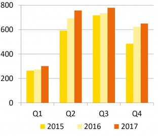 PTT:n jäsenyritysten toimittamat omakotitalot kuluttaja-asiakkaille 2015-2017 vuosineljänneksittäin